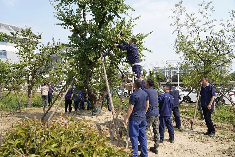 正值公司果園杏樹豐收季節,沉甸甸的果實掛滿枝頭,散發著誘人的香味。會前,公司黨委副書記、工會主席江心田和勞模同志們一起走進果園,開展了一場歡聲笑語的采摘活動,并一起分享了勞動成果。